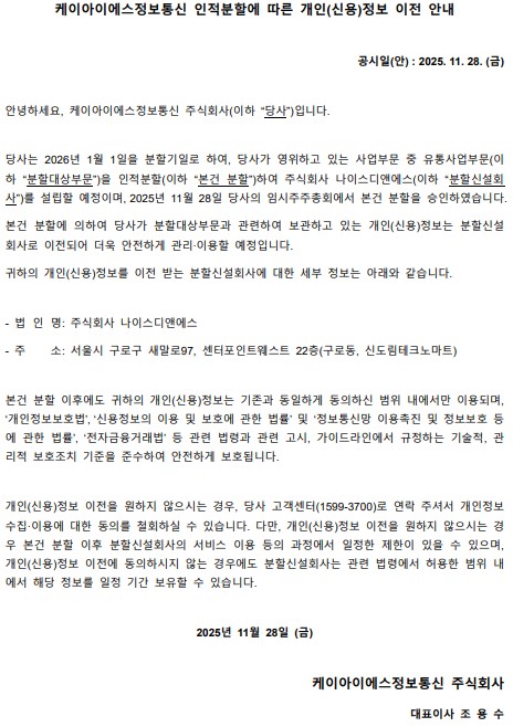[공지] 케이아이에스정보통신 인적분할에 따른 개인(신용)정보 이전 안내